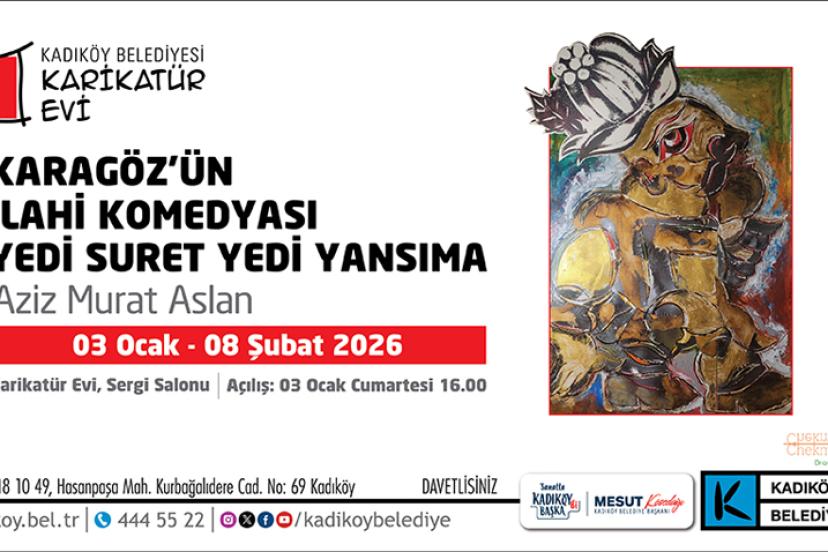 Sanatçı Aziz Murat Aslan’ın eserlerinden oluşan “Karagöz’ün İlahi Komedyası: Yedi Suret Yedi Yansıma” sergisi, 3 Ocak – 8 Şubat tarihleri arasında Kadıköy Belediyesi Karikatür Evi’nde sanatseverlerle buluşuyor.