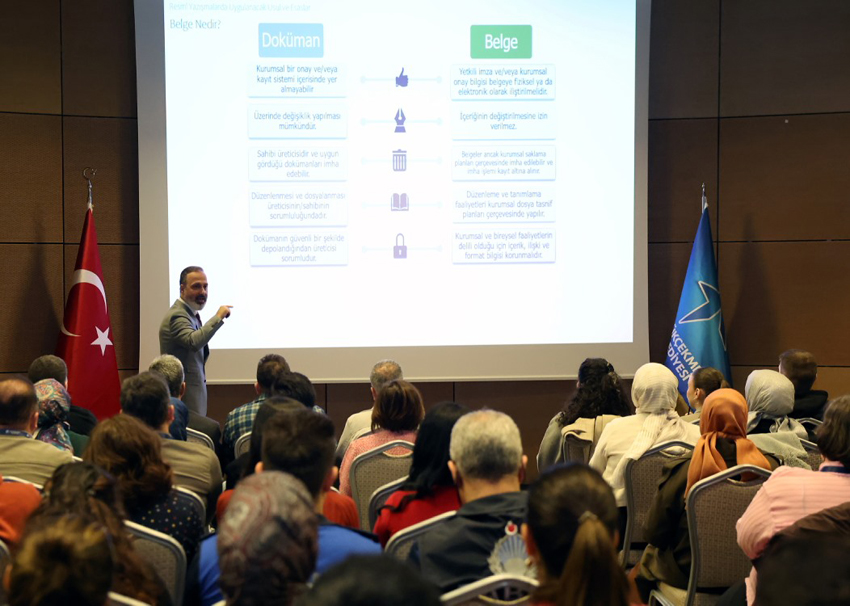 İstanbul Büyükşehir Belediyesi Yazı İşleri Şube Müdürü Yusuf Kara, resmi yazışmalarda uyulması gereken kurallar, mevzuat kullanımı, üst yazının bölümleri ve sık yapılan hatalar hakkında bilgi verdi. Ayrıca metin oluştururken dikkat edilmesi gereken hususlara değinildi.