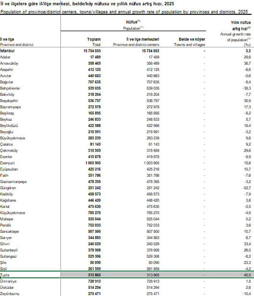 TÜİK’in 2025 ADNKS verilerine göre Tuzla, binde 40,5’lik nüfus artış hızıyla İstanbul’un en hızlı büyüyen ilçesi oldu.